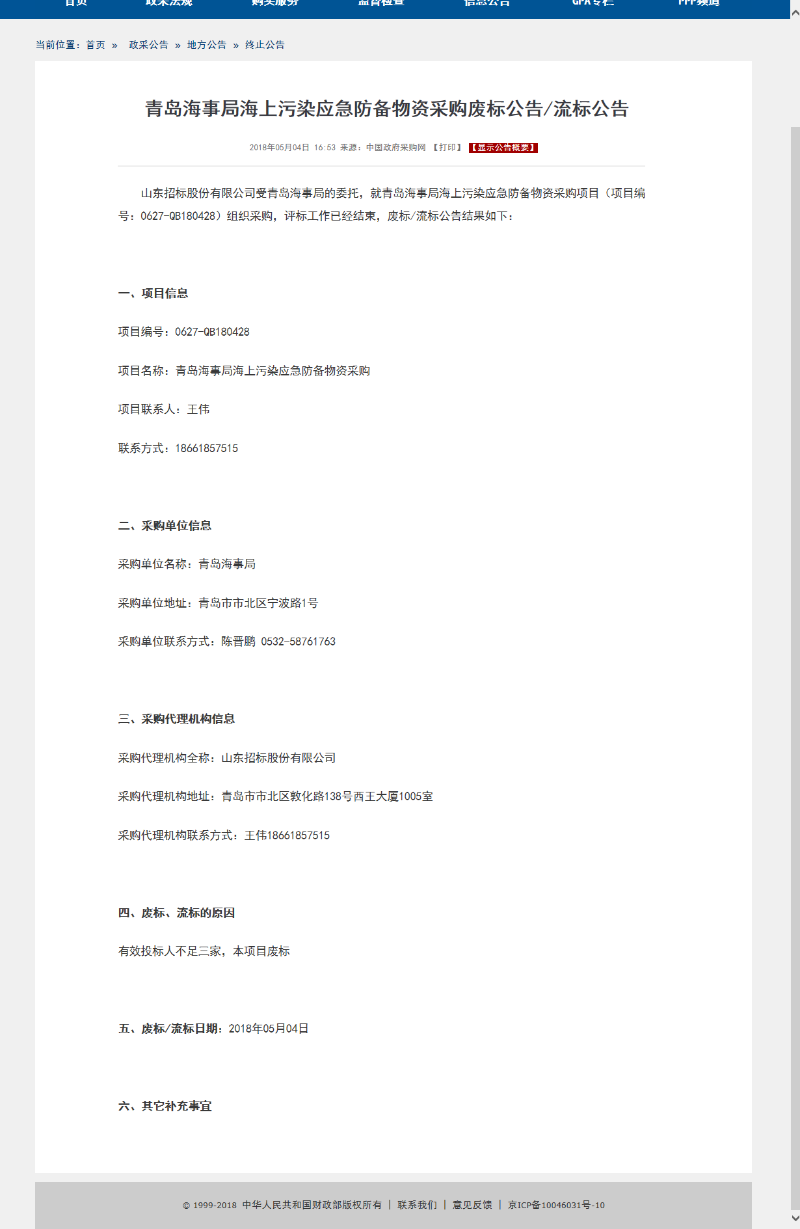 青岛海事局海上污染应急防备物资采购废标公告流标公告