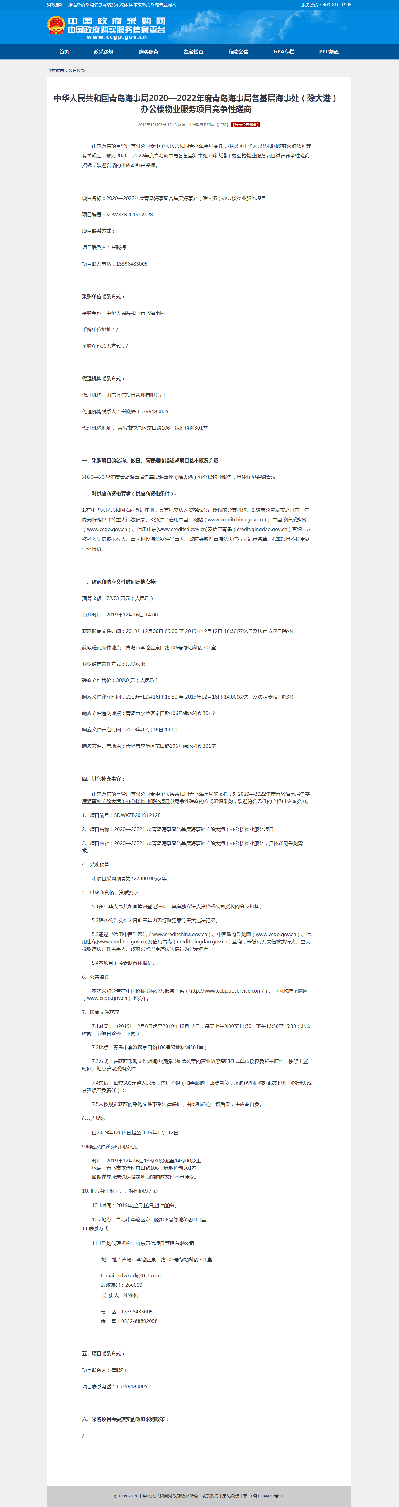 2020—2022年度青岛海事局各基层海事处(除大港)办公楼物业服务项目竞争性磋商公告