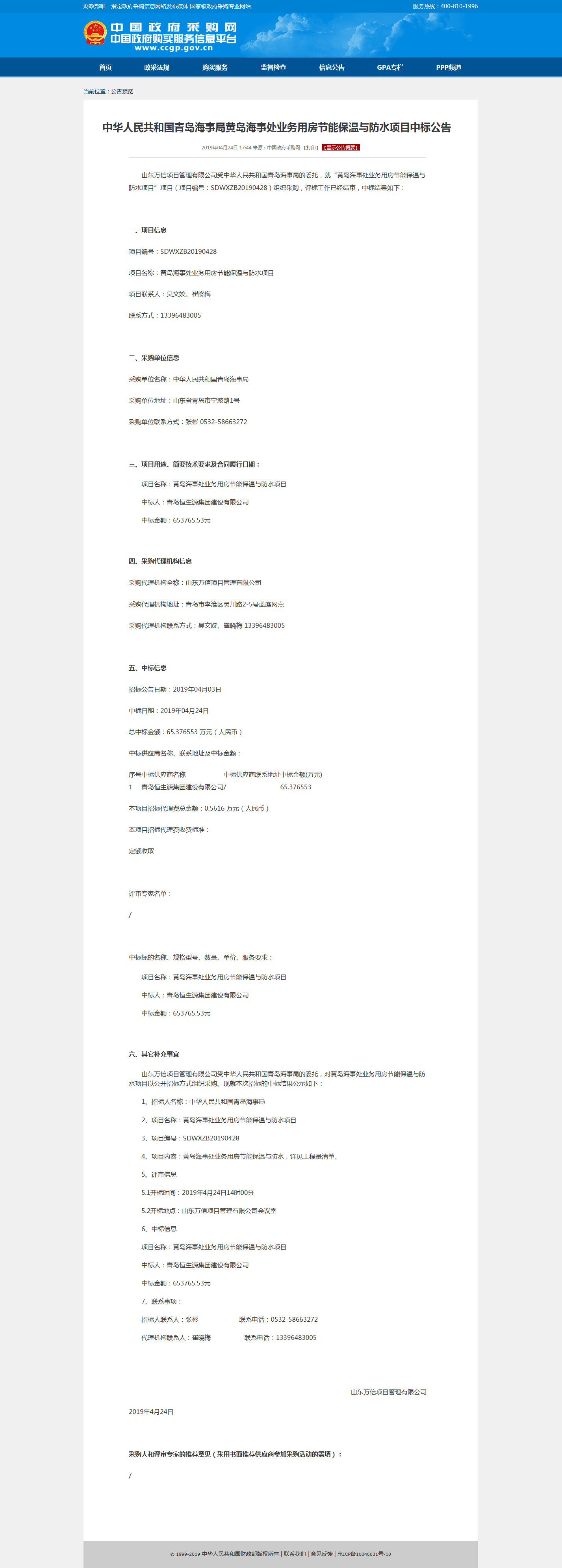 中华人民共和国青岛海事局黄岛海事处业务用房节能保温与防水项目中标公告