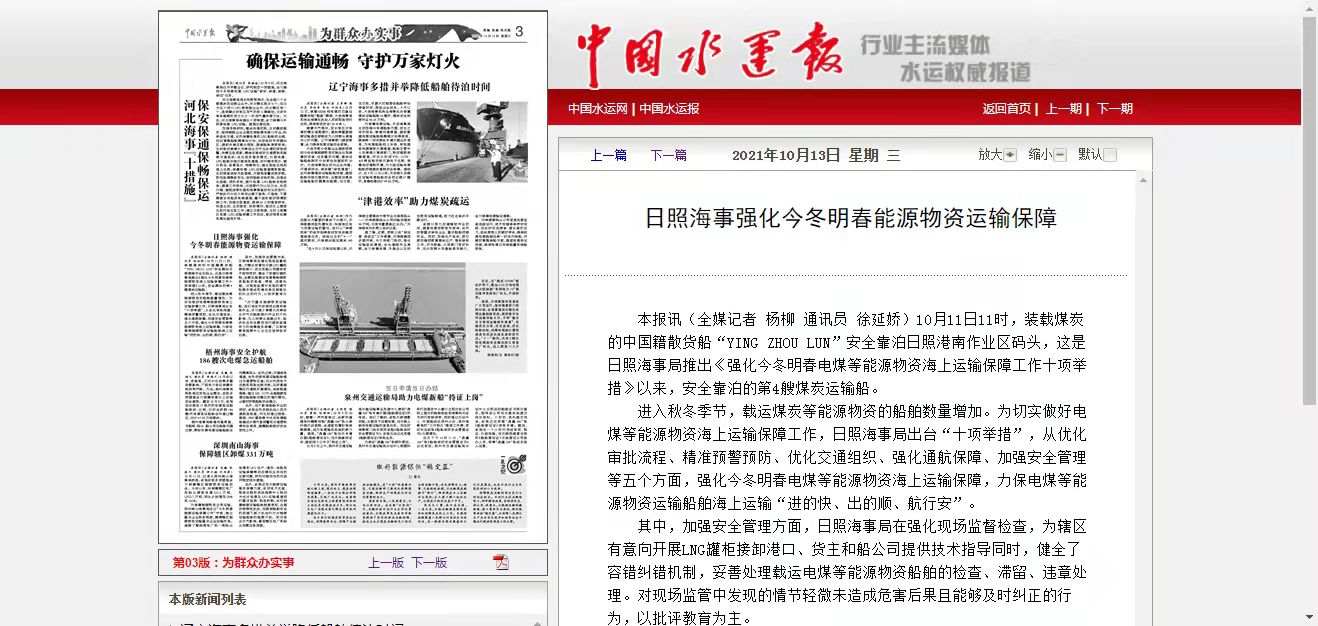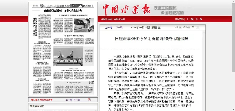 中国水运报:日照海事强化今冬明春能源物资运输保障
