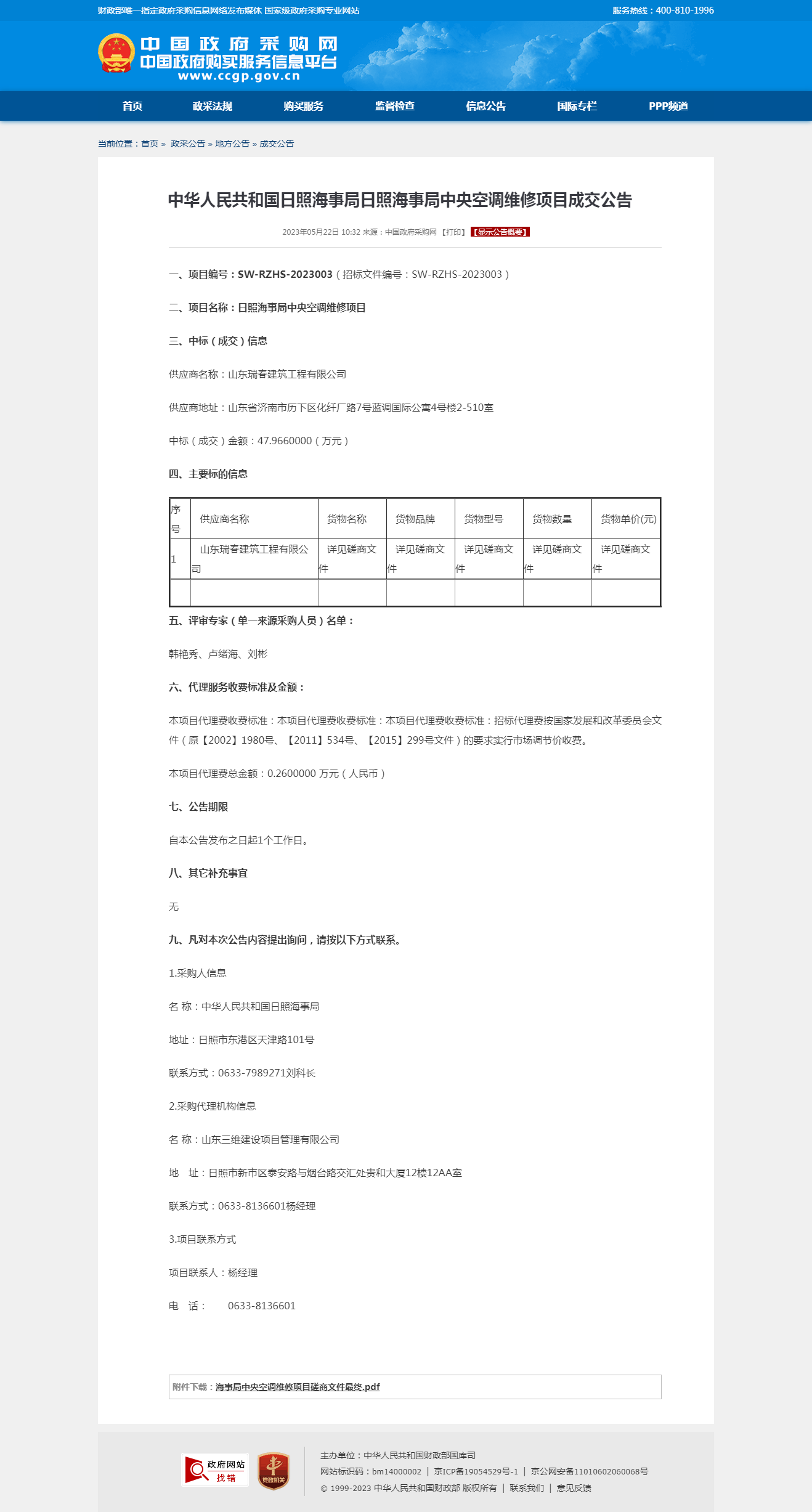 日照海事局中央空调维修项目成交公告