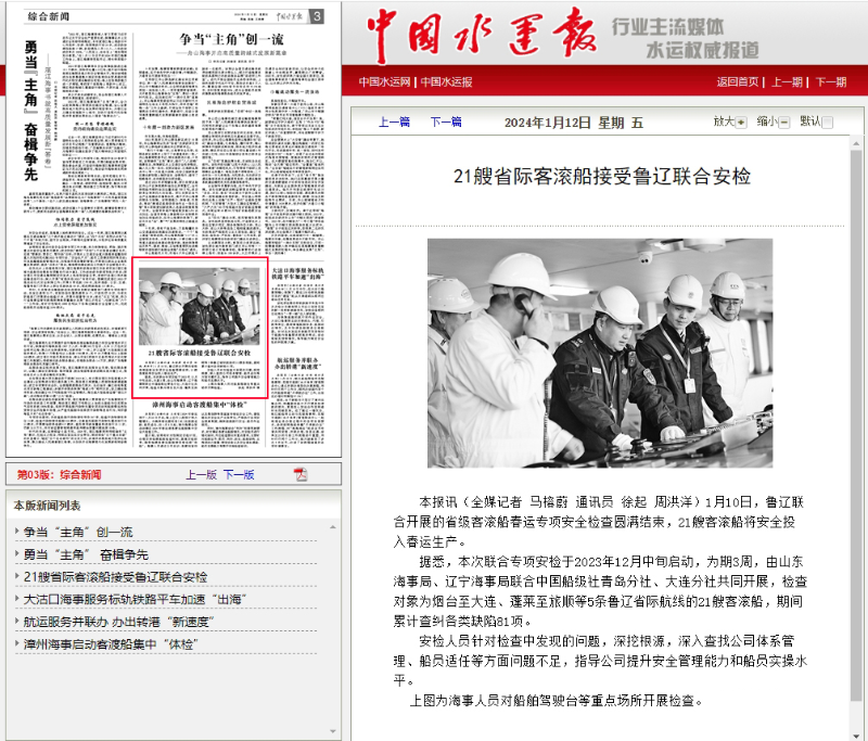 中国水运报:21艘省际客滚船接受鲁辽联合安检