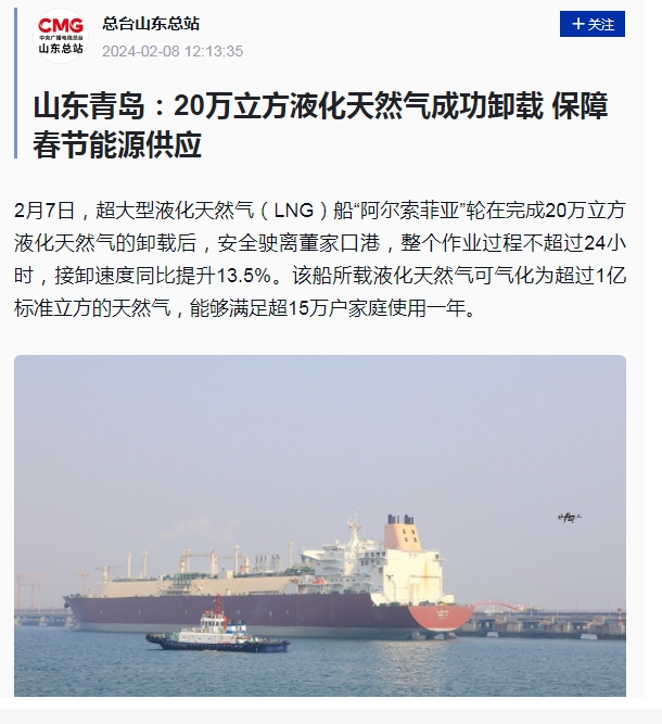 央视新闻客户端:山东青岛 20万立方液化天然气成功卸载 保障春节能源供应