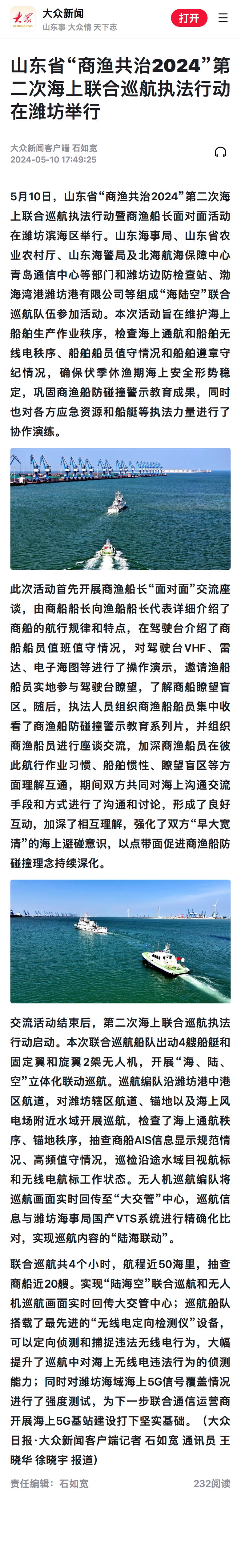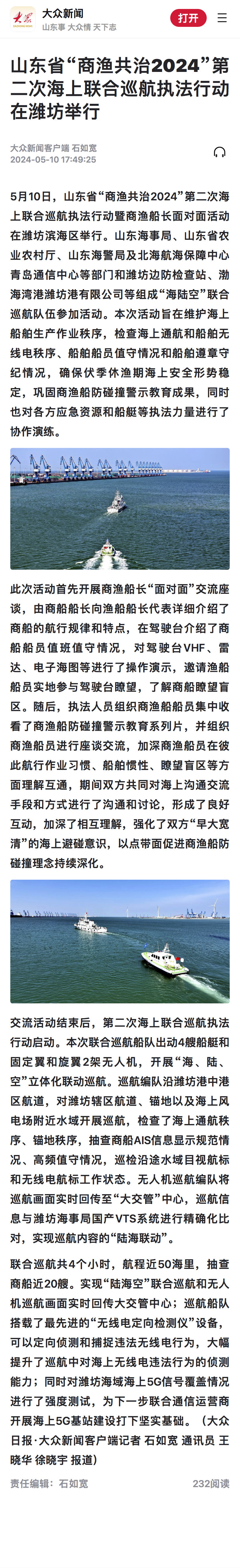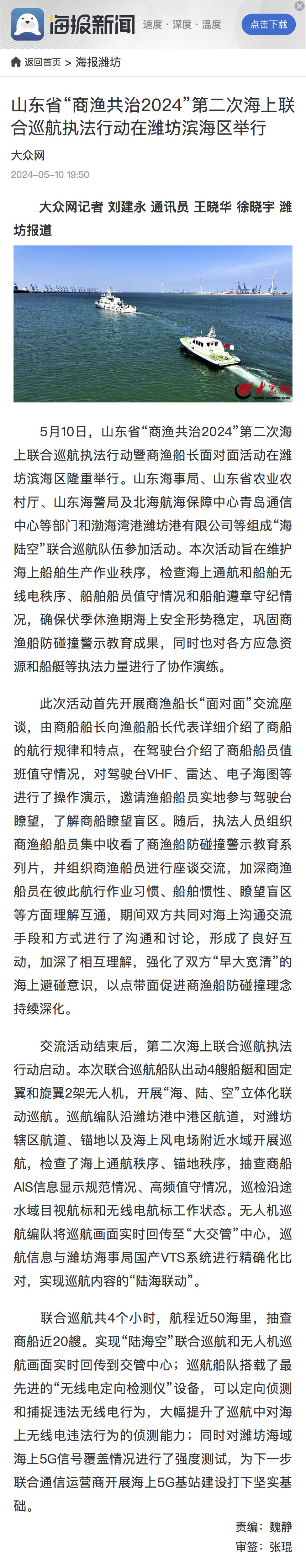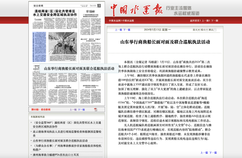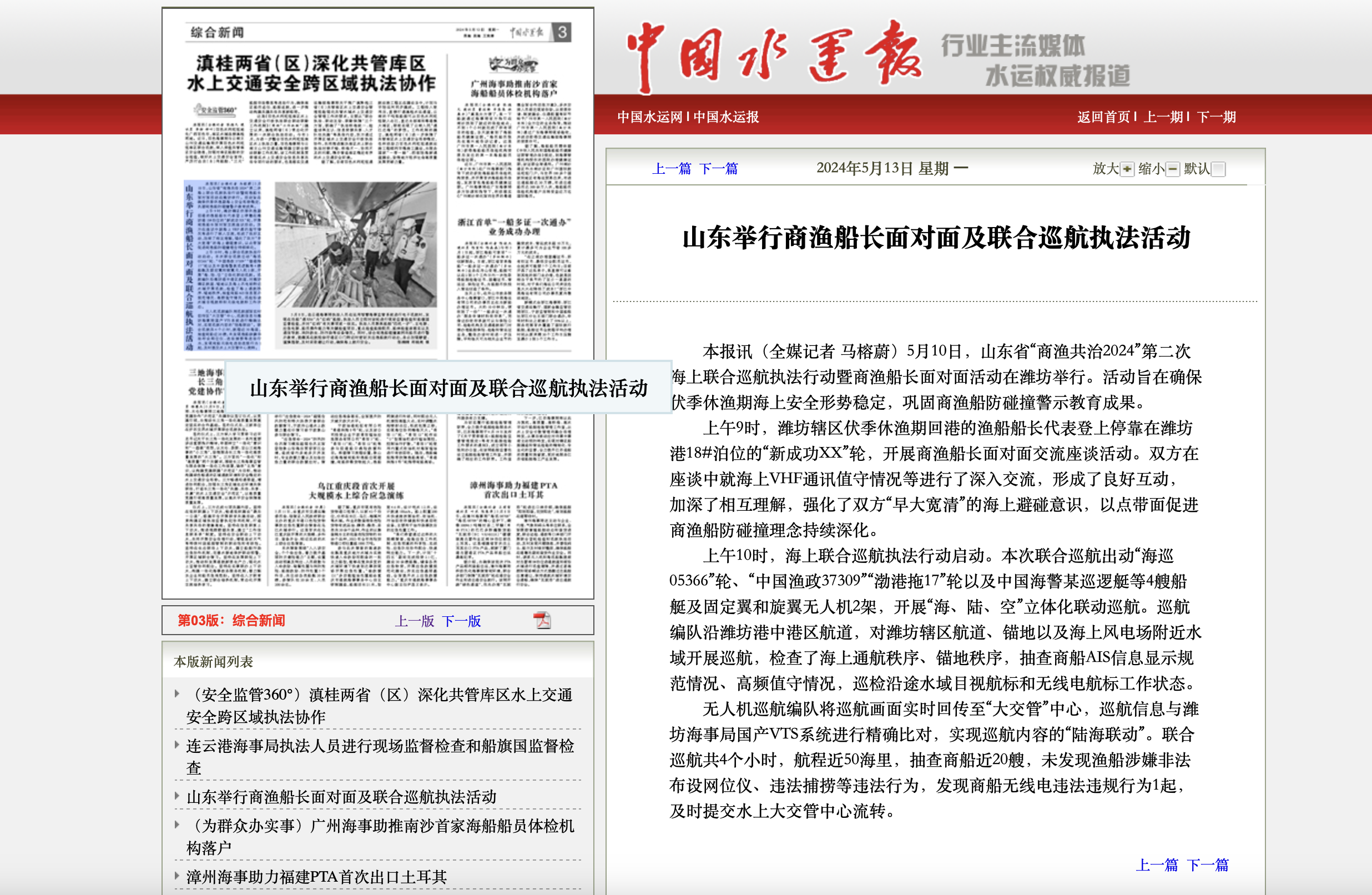 中国水运报、大众新闻、海报新闻:山东举行商渔船长面对面及联合巡航执法活动