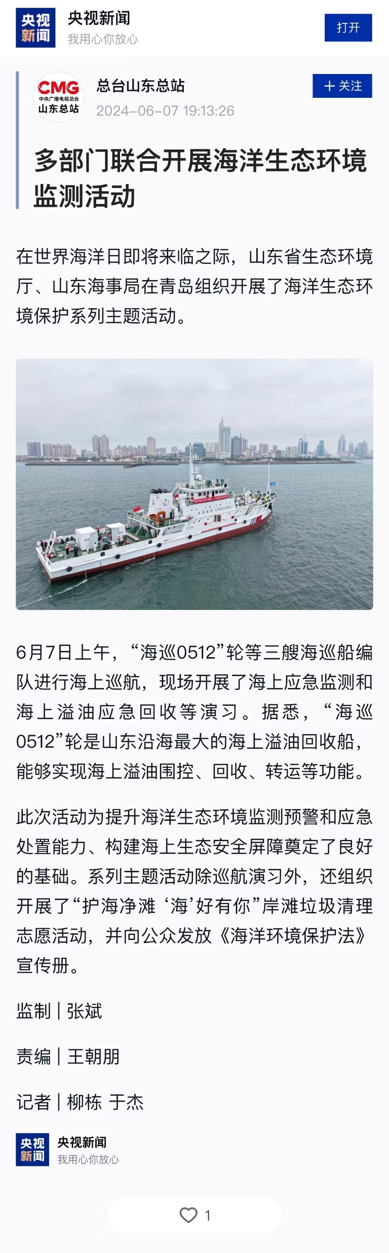 央视新闻:多部门联合开展海洋生态环境检测活动