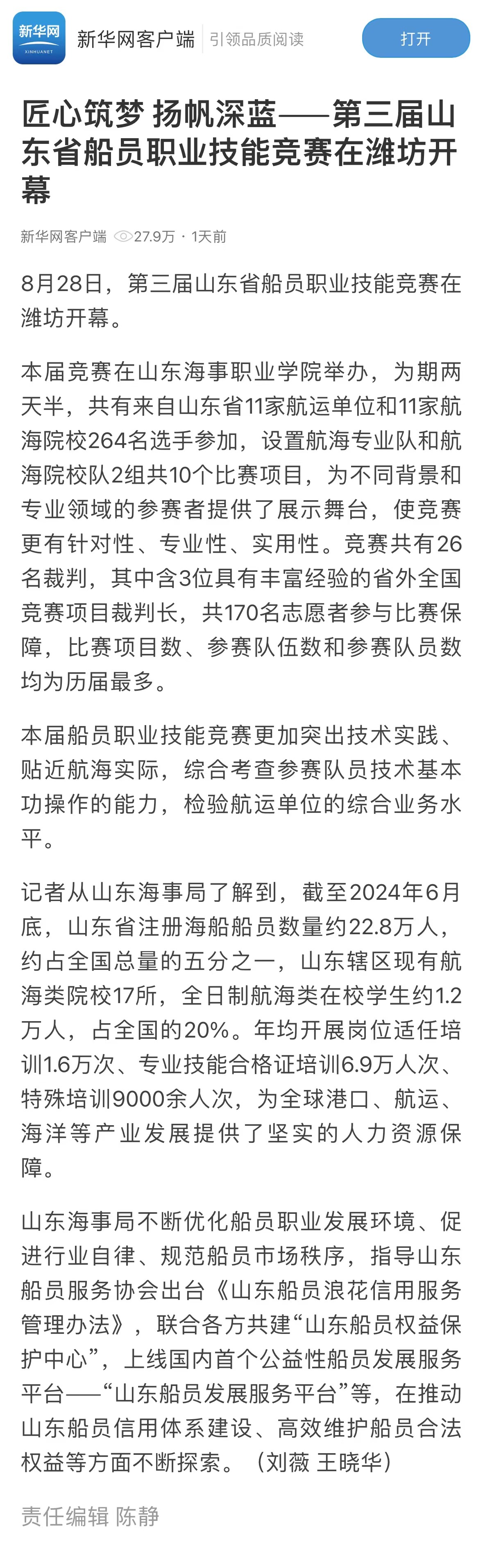 新华社:匠心筑梦 扬帆深蓝——第三届山东省船员职业技能竞赛在潍坊开幕