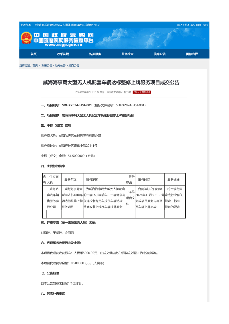 威海海事局大型无人机配套车辆达标整修上牌服务项目成交公告