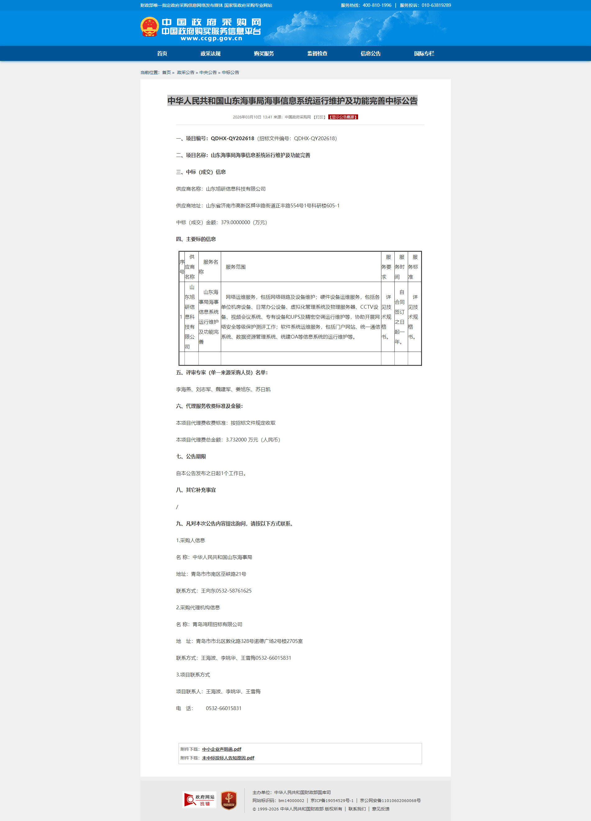 山东海事局海事信息系统运行维护及功能完善中标公告