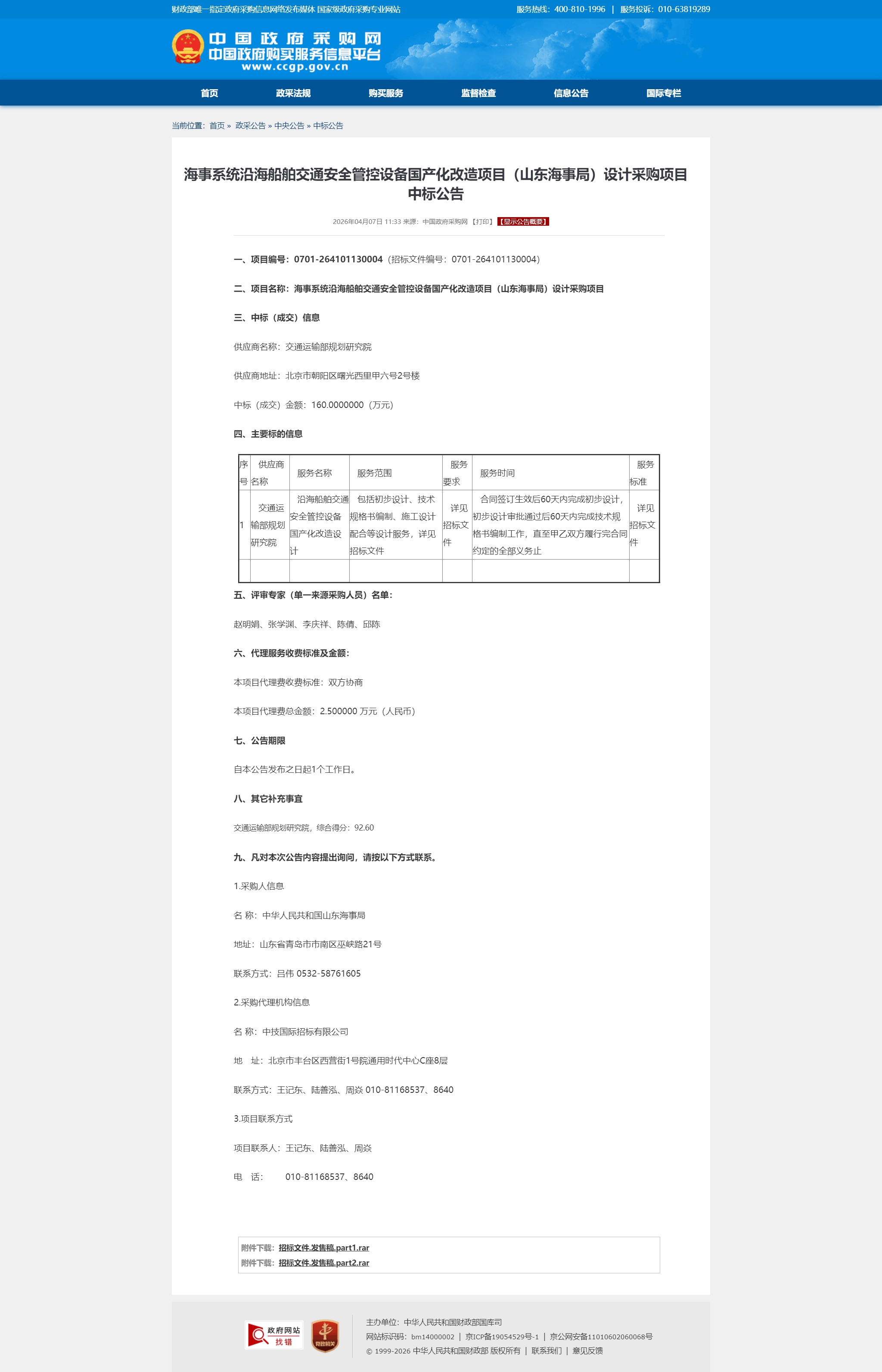 船舶交通安全管控设备国产化改造设计中标结果公告